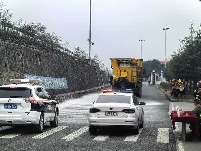 本次演练模拟凝冻天气,经营单位在开展错时巡查时,发现G56杭瑞高速(毕都段)K1832+000下行处,有一辆小轿车因路面凝冻发生交通事故,无法继续正常行驶,影响道路交通安全。各单位接到报警电话后,迅速按照既定方案开展救援,执法人员协助交警维护现场交通秩序同时,组织应急部门对事故车辆开展救援,将车辆拖离现场;养护人员在现场设置警示提示标志,利用融雪剂撒布车对现场开展除冰作业;执法人员对事故现场的路产损失进行现场勘验并上报相关信息;演练现场紧张而有序,各参演单位相互协作、密切配合,圆满完成了本次应急处置演练任务。